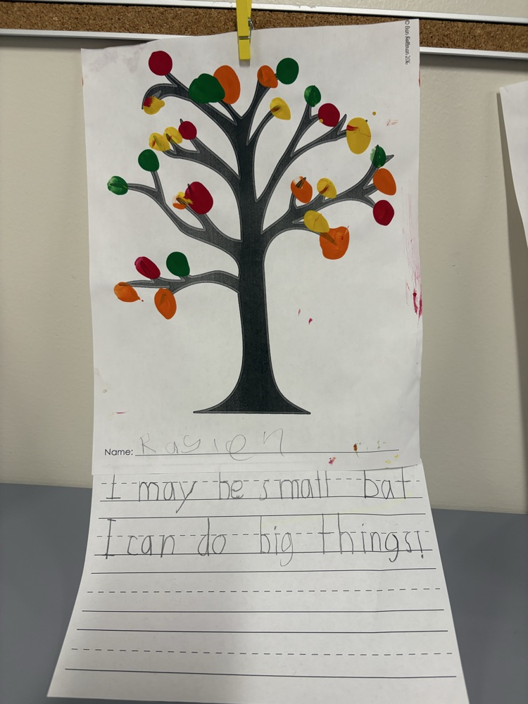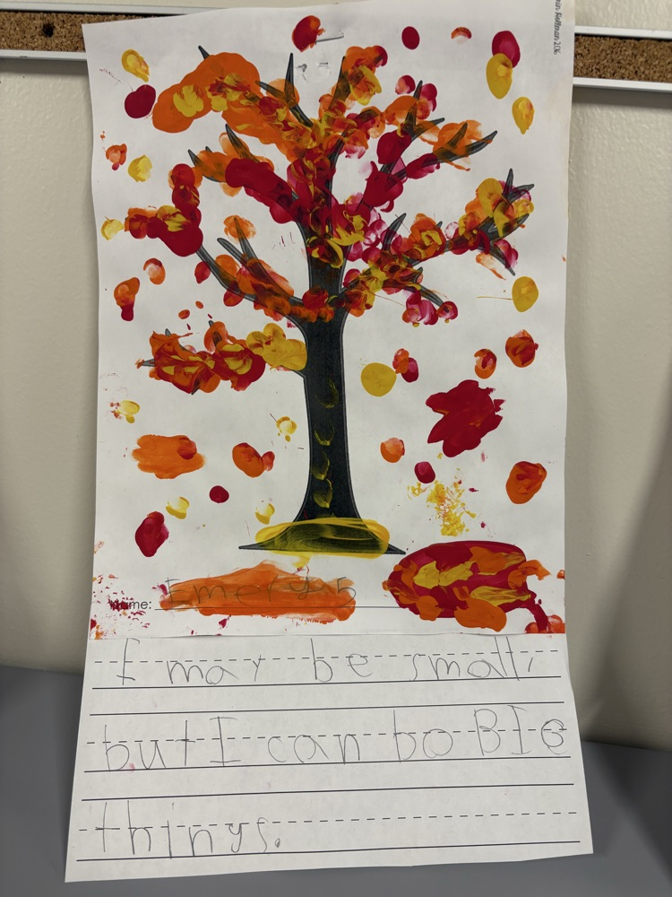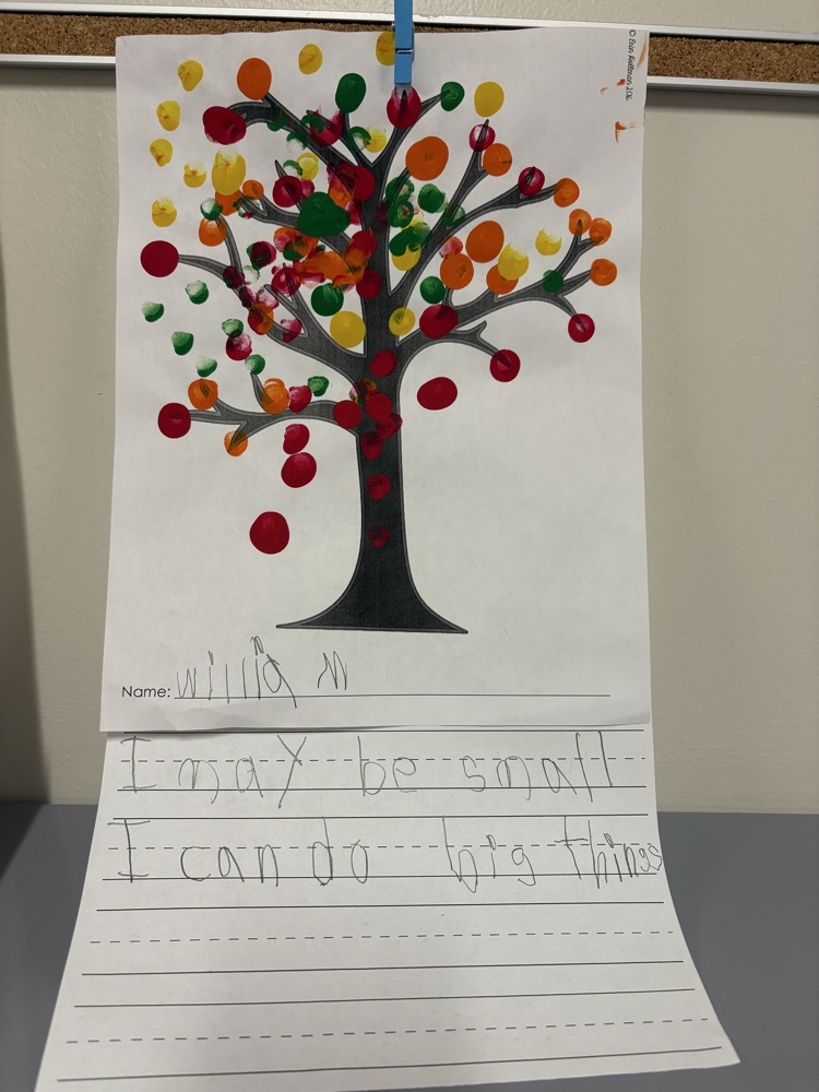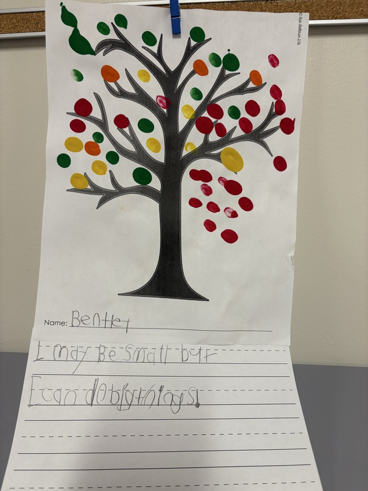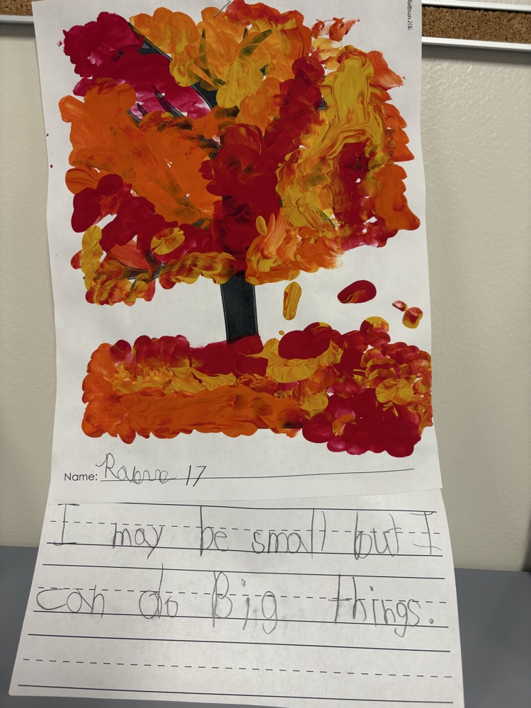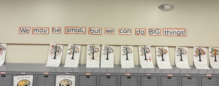 First grade wrapped up their unit "Different Lands, Similar Stories". They listened to several folktales that originated from countries all around the world. They learned several lessons in these stories with our favorite being: "We may be small, but we can do BIG things!" This lesson came from 3 of the stories they listened to where the character was as small as a thumb, but still helped others in very big ways. Students used their thumbs to make these big, beautiful fall trees with a reminder that they can do big things in this world.